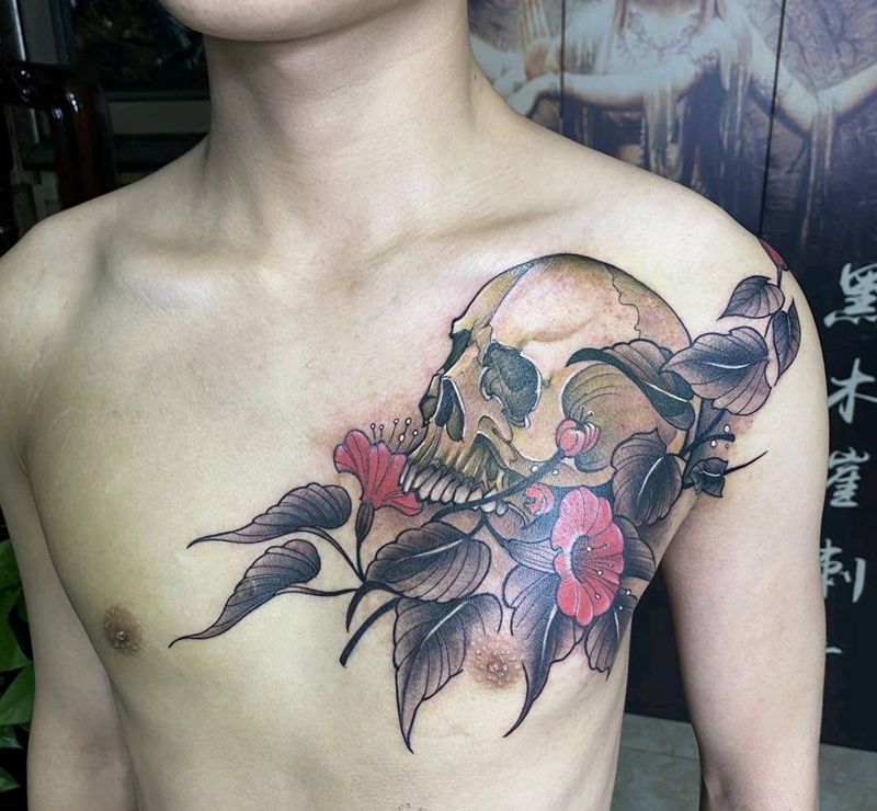 死亡与生命纹身图片_胸部New School骷髅纹身图案