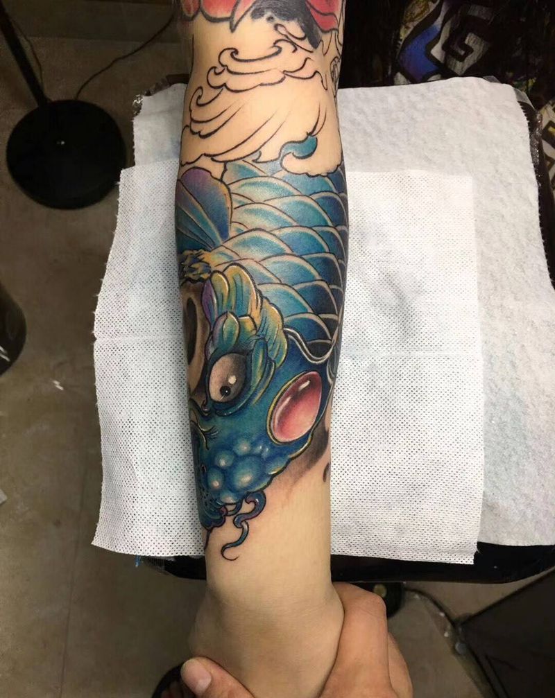 当前位置: 首页 >海南省海口市纹身店-黑木崖刺青艺术工作室纹身图案>鱼纹身图片_成品手臂传统动物纹身图案
