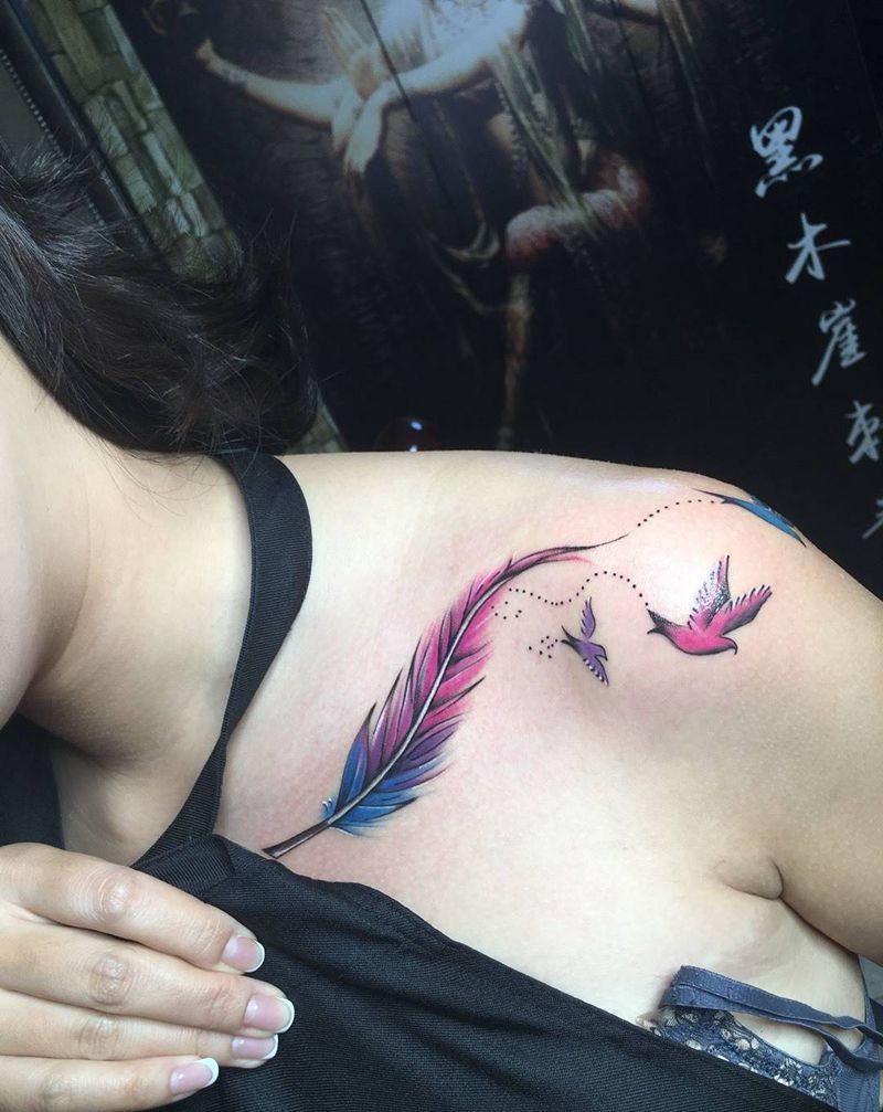 当前位置: 首页 >海南省海口市纹身店-黑木崖刺青艺术工作室纹身图案>羽毛纹身图片_肩部清新原创纹身图案