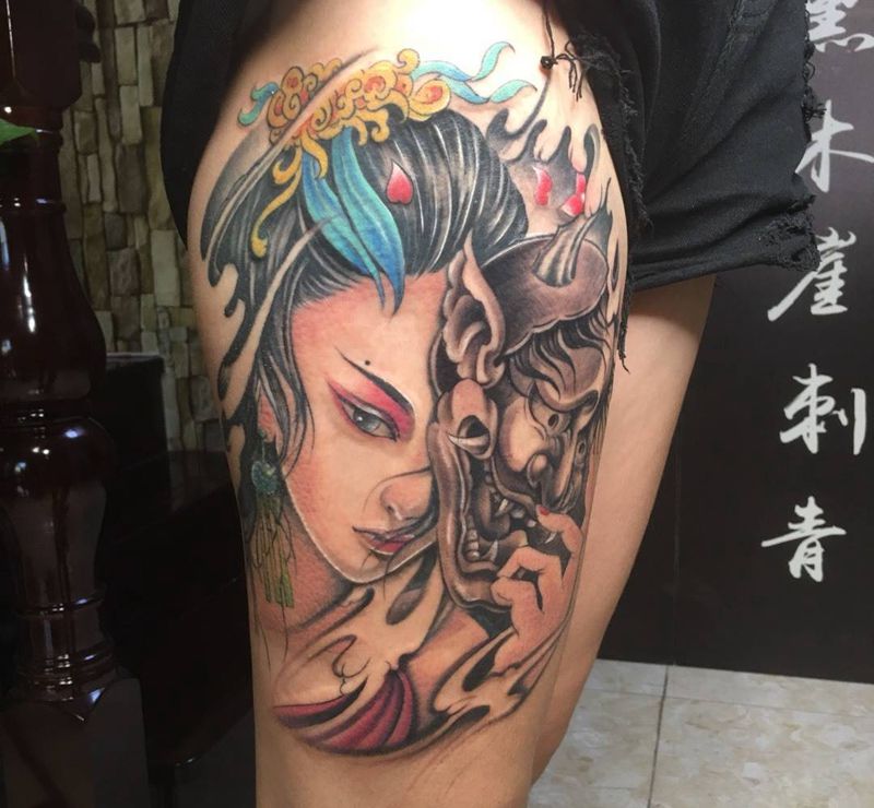 当前位置: 首页 >海南省海口市纹身店-黑木崖刺青艺术工作室纹身图案>艺妓纹身图片_腿部新传统纹身图案