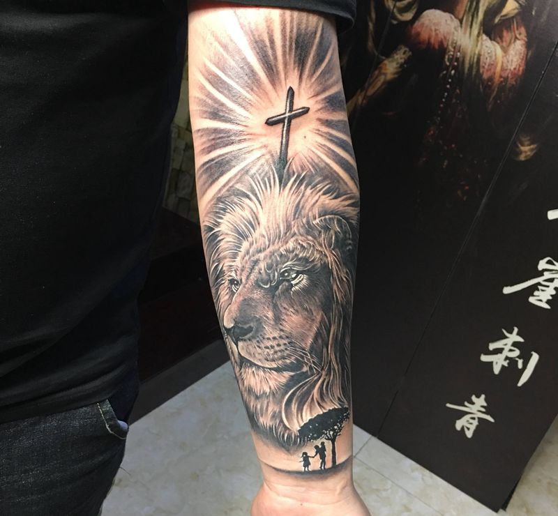 当前位置: 首页 >海南省海口市纹身店-黑木崖刺青艺术工作室纹身图案>守护纹身图片_手臂欧美写实狮子纹身图案