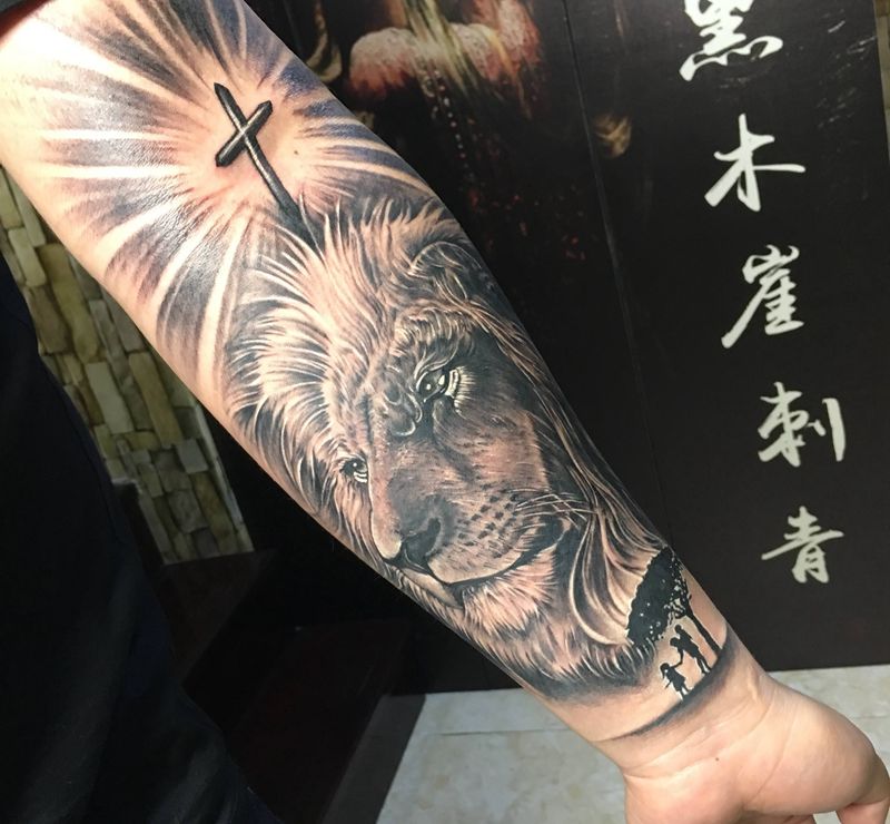 当前位置: 首页 >海南省海口市纹身店-黑木崖刺青艺术工作室纹身图案>守护纹身图片_手臂欧美写实狮子纹身图案
