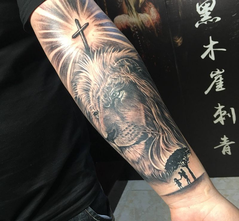 当前位置: 首页 >海南省海口市纹身店-黑木崖刺青艺术工作室纹身图案>守护纹身图片_手臂欧美写实狮子纹身图案