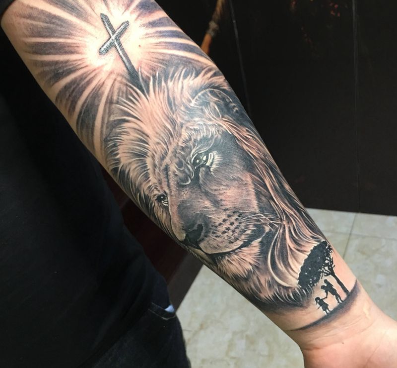 当前位置: 首页 >海南省海口市纹身店-黑木崖刺青艺术工作室纹身图案>守护纹身图片_手臂欧美写实狮子纹身图案