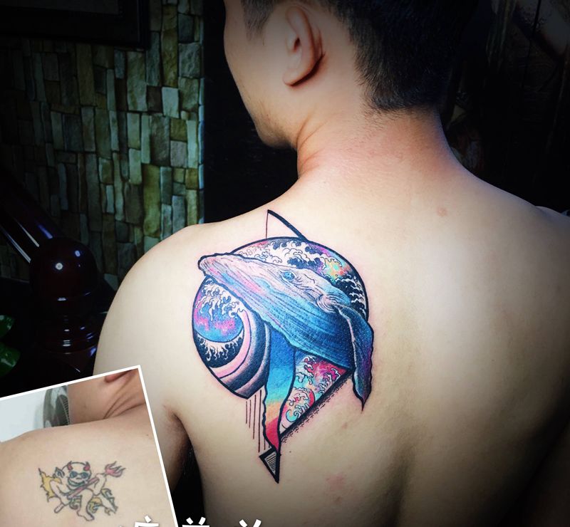 当前位置: 首页 >海南省海口市纹身店-黑木崖刺青艺术工作室纹身图案>鲸鱼遮盖纹身图片_肩部几何水彩纹身图案