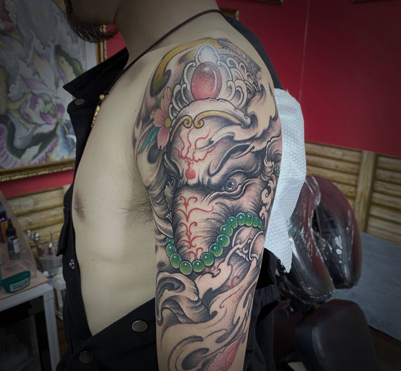 当前位置: 首页 >海南省海口市纹身店-黑木崖刺青艺术工作室纹身图案>象神纹身图片_手臂新传统纹身图案