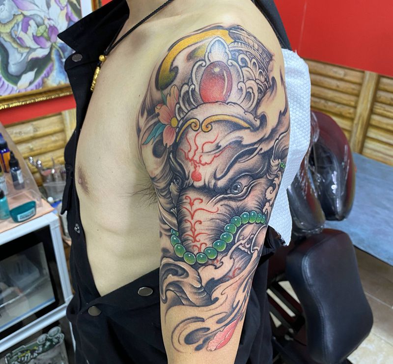 当前位置: 首页 >海南省海口市纹身店-黑木崖刺青艺术工作室纹身图案>象神纹身图片_手臂新传统纹身图案