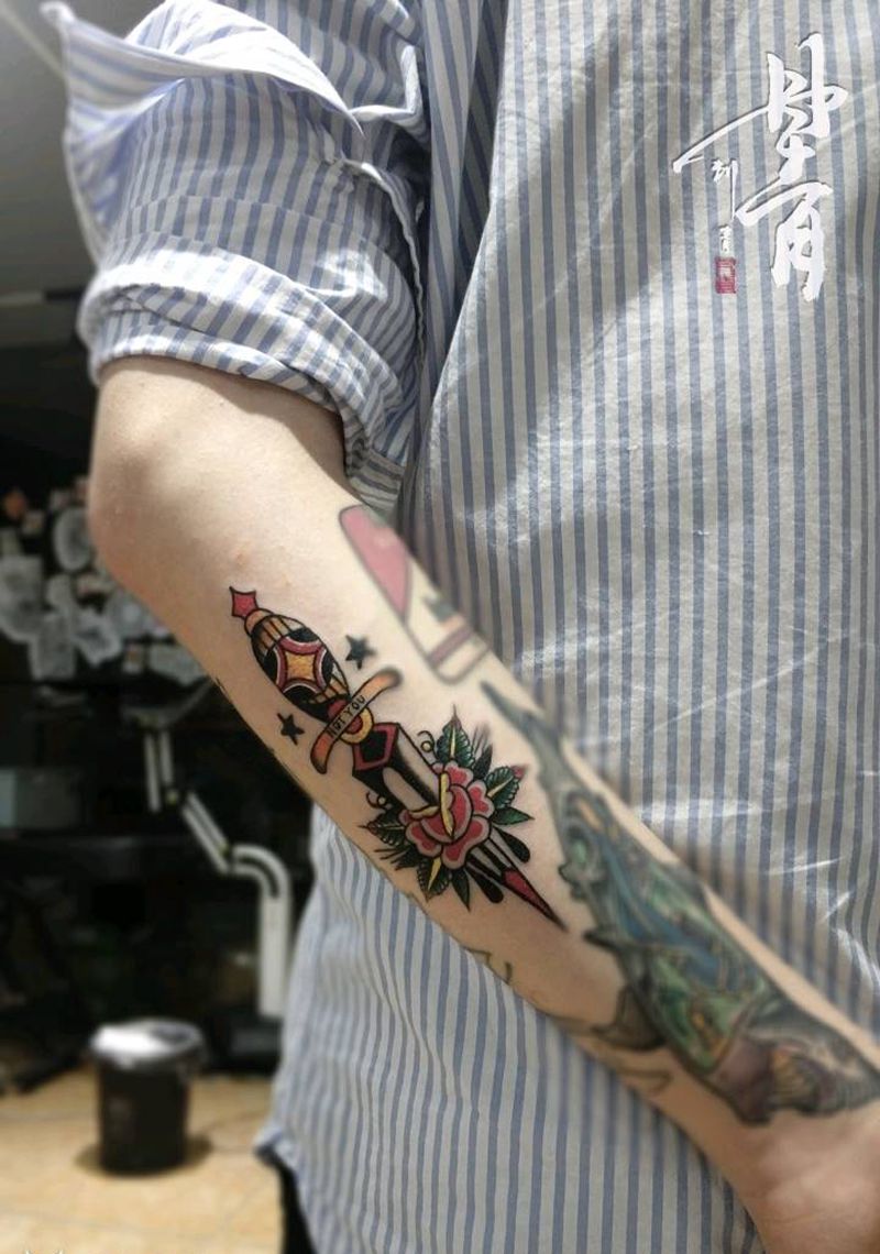 当前位置: 首页 >海南省海口市纹身店-海口喜鹊刺青艺术工作室纹身图案>oldschool匕首纹身图片_手臂欧美成品纹身图案