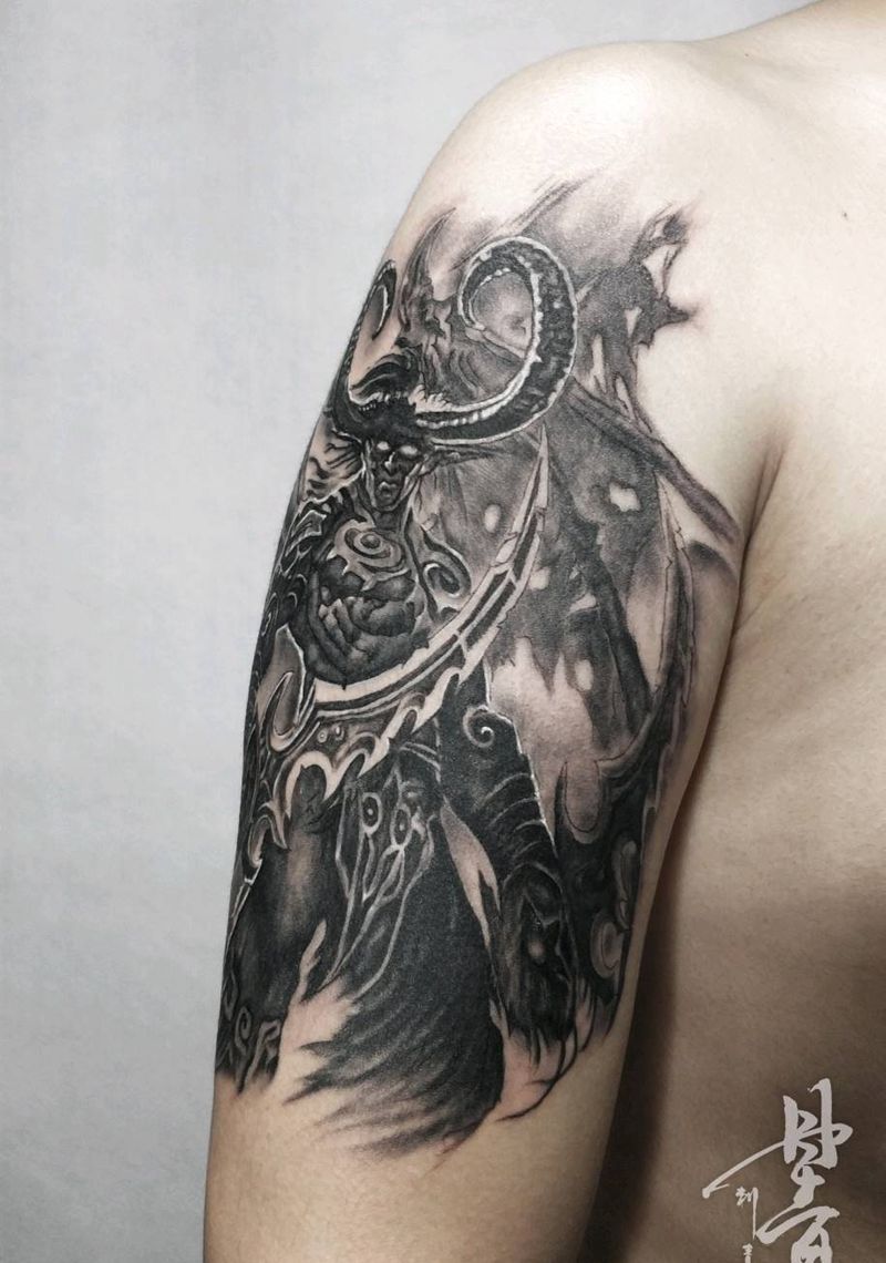 恶魔猎手纹身图片_肩部欧美人物鬼神成品纹身图案
