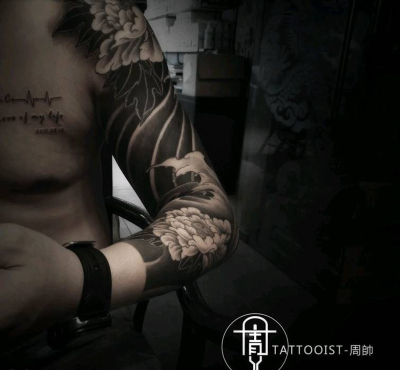 当前位置: 首页 >海南省海口市纹身店-海口喜鹊刺青艺术工作室纹身图案>传统水浪牡丹花臂纹身图片