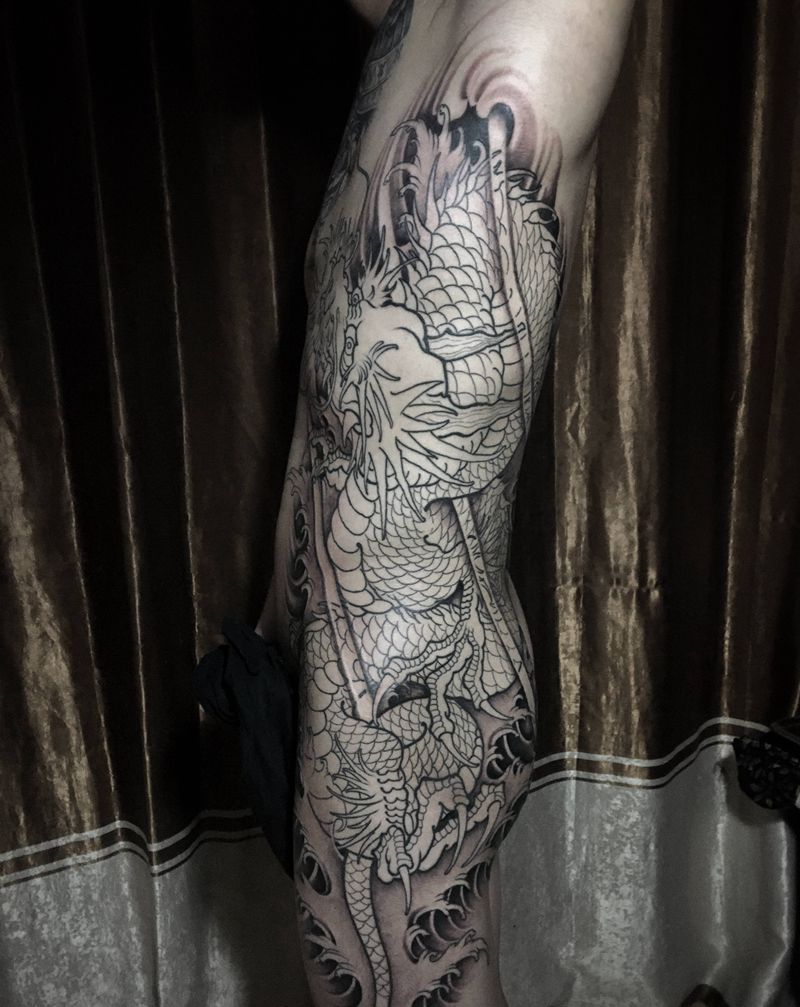 • T网红王老大花腿龙纹身图片_腿部新传统纹身图案