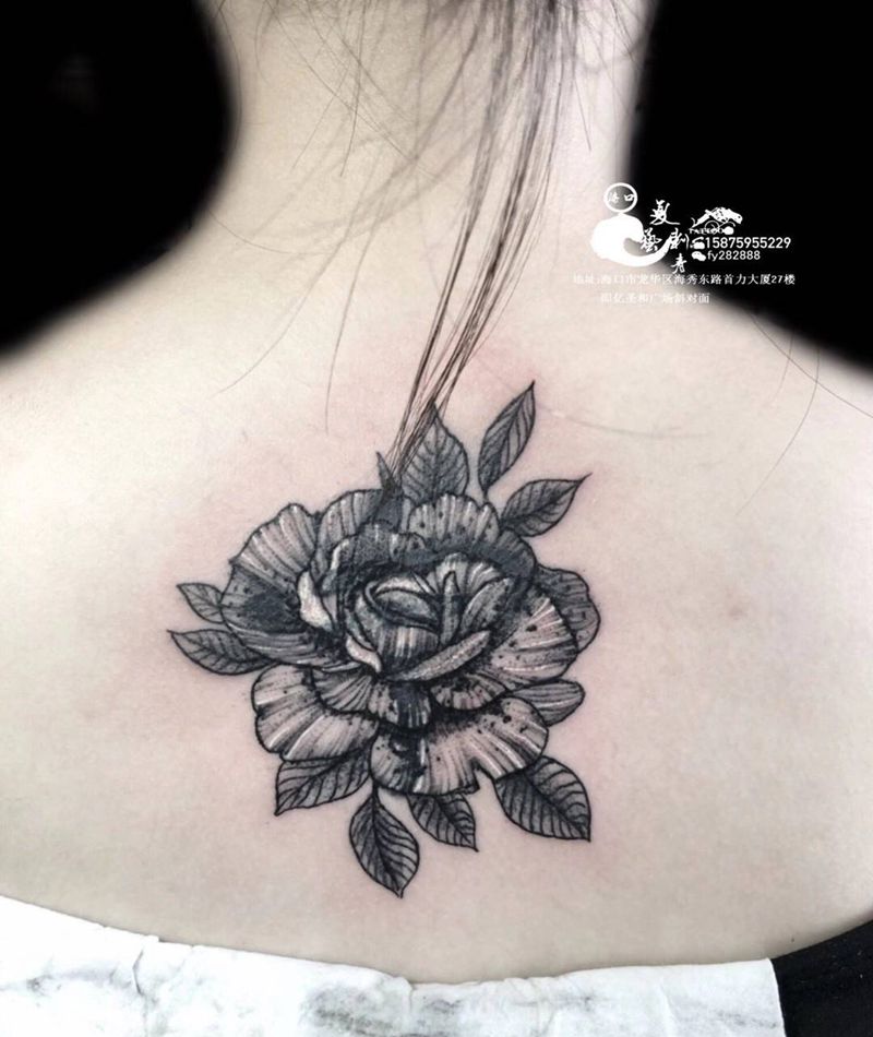 素花遮盖宁字纹身图片_背部欧美写实纹身图案