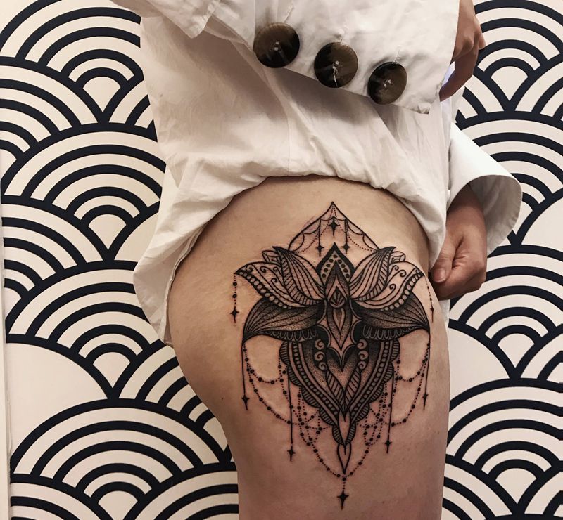 点刺梵花纹身图片_腿部纹身图案