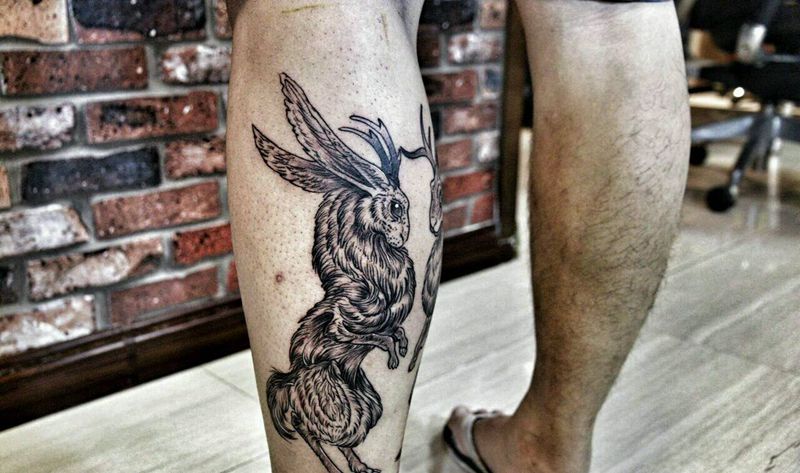 当前位置: 首页 >海南省海口市纹身店-海口盛刺青HKstattoo纹身图案>兔子纹身图片_腿部传统动物成品纹身图案