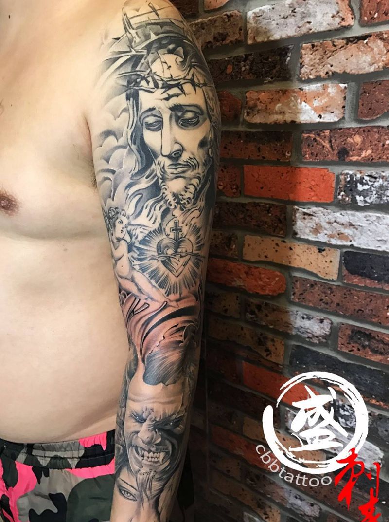 耶稣花臂纹身图片_成品手臂手部欧美写实宗教人物静物纹身图案