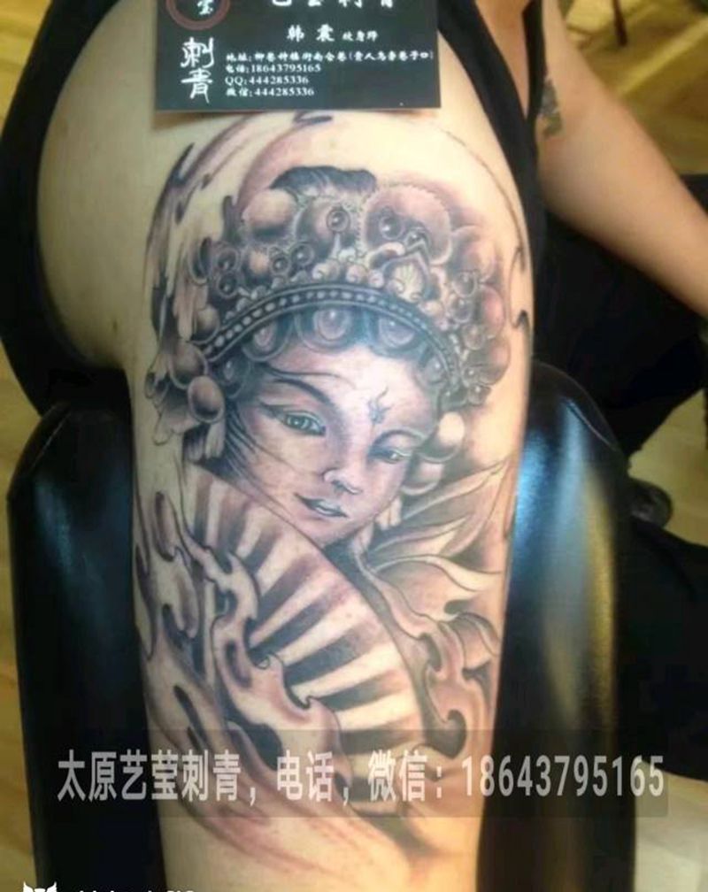 当前位置: 首页 >海南省海口市纹身店-艺莹刺青纹身图案>大臂花旦纹身图片_肩部手臂传统人物成品纹身图案