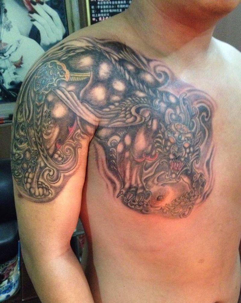 貔貅半甲纹身图片_成品肩部胸部传统动物鬼神纹身图案