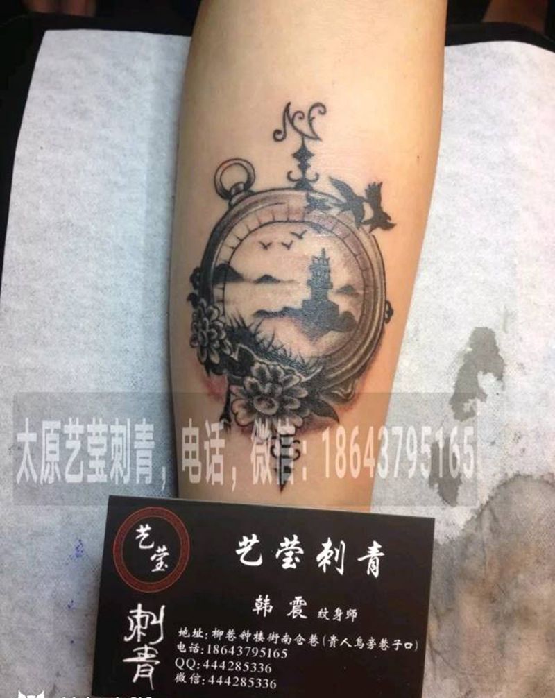当前位置: 首页 >海南省海口市纹身店-艺莹刺青纹身图案>情侣纹身,怀表纹身图片_手臂欧美静物情侣成品纹身图案