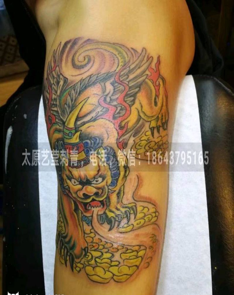 彩色貔貅纹身图片_肩部手臂传统动物鬼神成品纹身图案