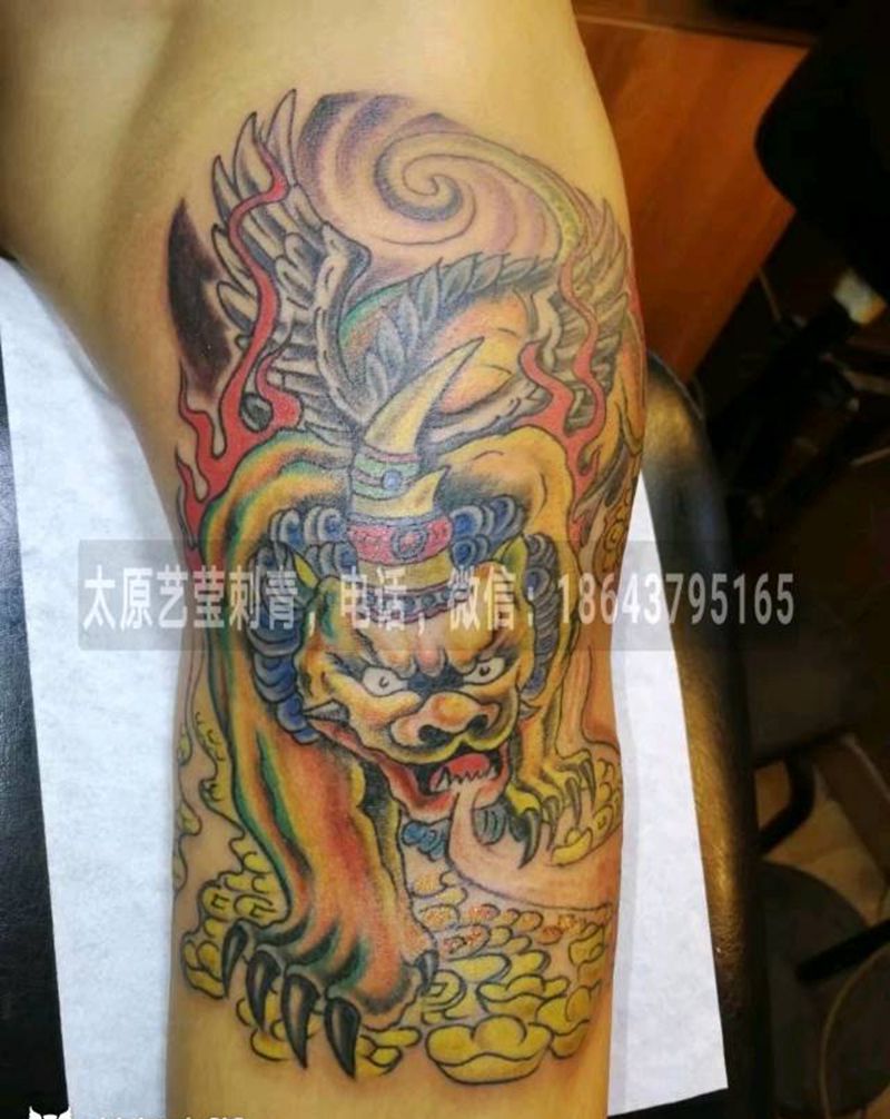 彩色貔貅纹身图片_肩部手臂传统动物鬼神成品纹身图案