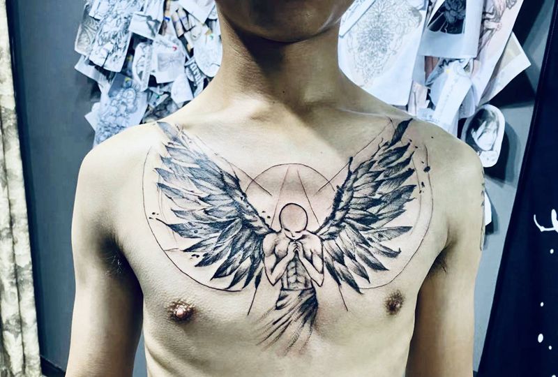 祈祷天使纹身图片_胸部点刺纹身图案