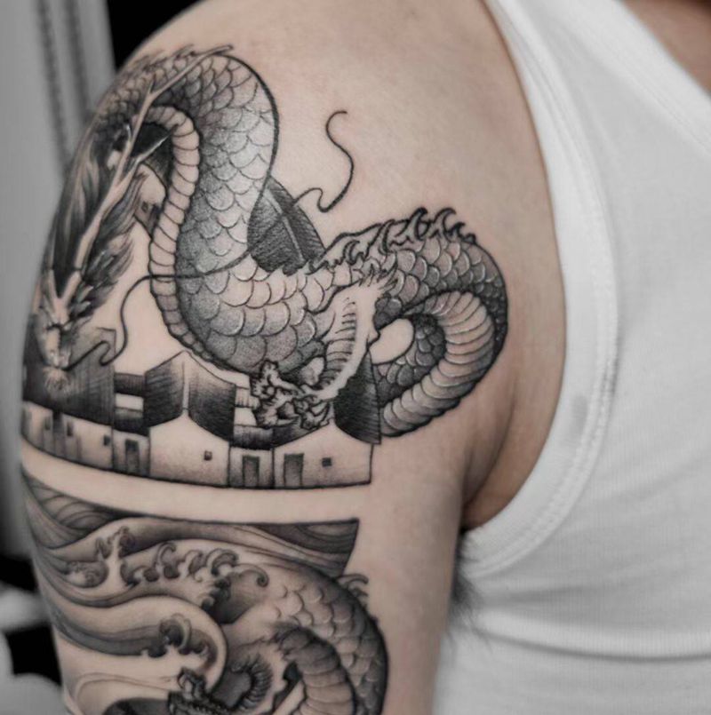 乡愁【丰兄作品】纹身图片_手臂新传统龙建筑原创纹身图案