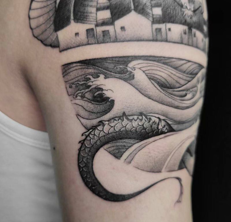 乡愁【丰兄作品】纹身图片_手臂新传统龙建筑原创纹身图案