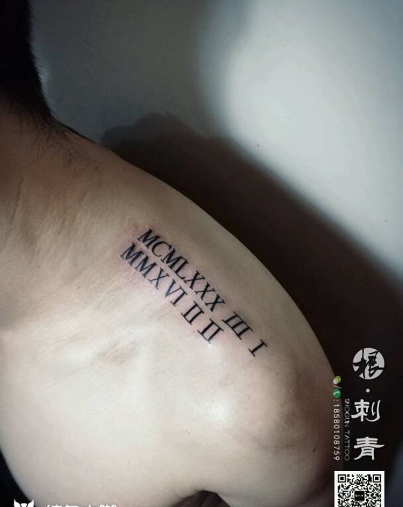 肩上扛的是责任纹身图片_肩部传统字符图腾原创罗马数字成品纹身图案