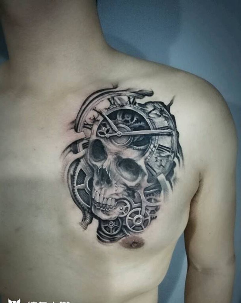 机械骷髅纹身图片_胸部欧美静物骷髅机械成品纹身图案