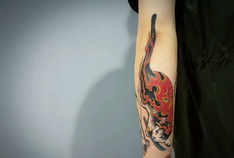 当前位置: 首页 >重庆市纹身店-木良拾贰文身艺术工作室纹身图案>火焰猫纹身图片_手臂传统动物猫成品纹身图案
