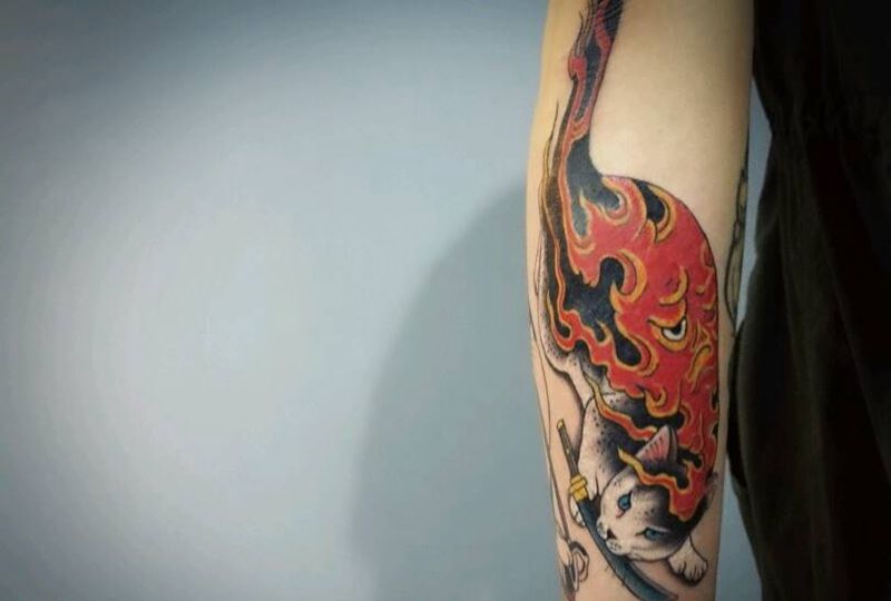 当前位置: 首页 >重庆市纹身店-木良拾贰文身艺术工作室纹身图案>火焰猫纹身图片_手臂传统动物猫成品纹身图案
