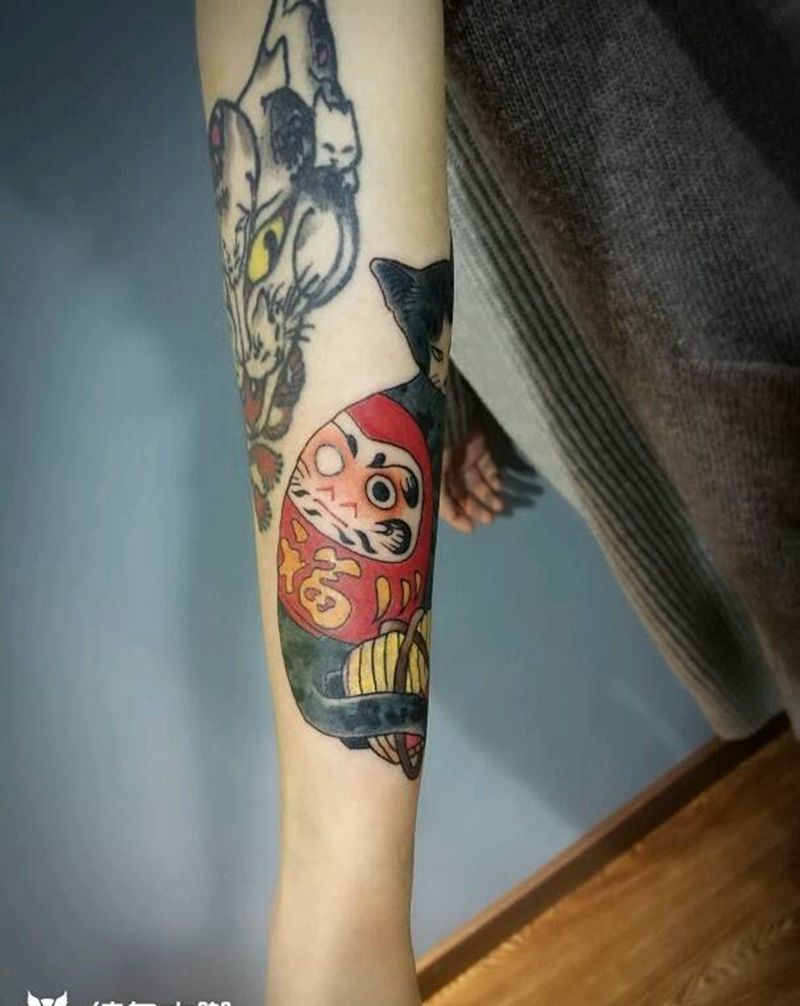 当前位置: 首页 >重庆市纹身店-木良拾贰文身艺术工作室纹身图案>达摩猫纹身图片_手臂传统动物猫达摩成品纹身图案