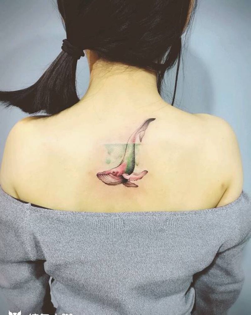 鲸鱼纹身图片_背部清新写实动物鲸鱼成品纹身图案
