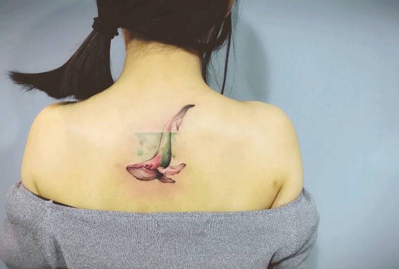 当前位置: 首页 >重庆市纹身店-木良拾贰文身艺术工作室纹身图案>鲸鱼纹身图片_背部清新写实动物鲸鱼成品纹身图案