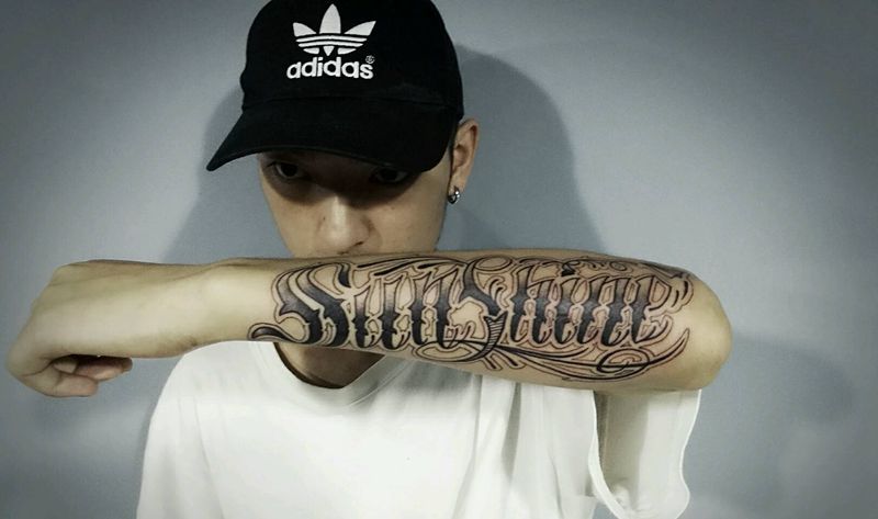 当前位置: 首页 >重庆市纹身店-木良拾贰文身艺术工作室纹身图案>奇卡诺纹身图片_手臂欧美字符原创奇卡诺成品纹身图案