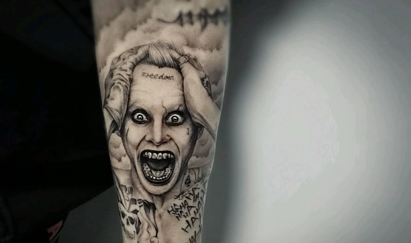 当前位置: 首页 >重庆市纹身店-木良拾贰文身艺术工作室纹身图案>乔克叔叔 根作品纹身图片_手臂欧美写实人物小丑成品纹身图案