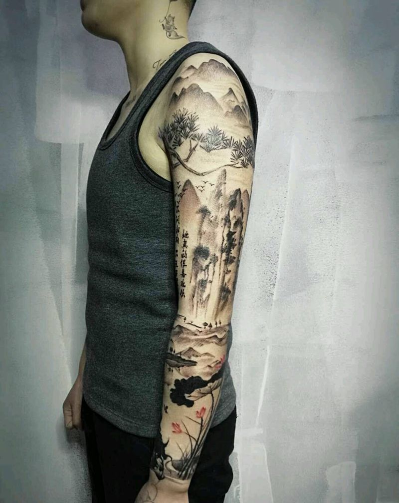 水墨风花臂 根作品纹身图片_手臂传统国画原创山水成品纹身图案