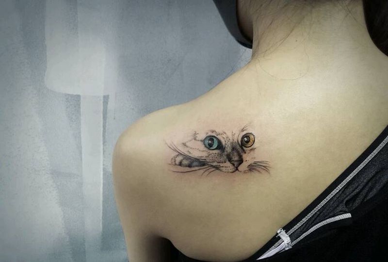 根作品纹身图片_背部清新动物猫重庆成品纹身图案