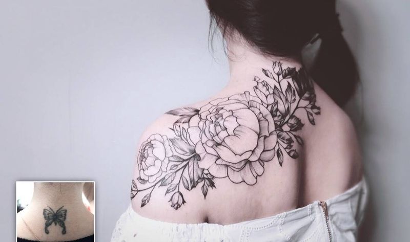 遮盖【丰作品】纹身图片_成品背部肩部清新植物玫瑰遮盖纹身图案