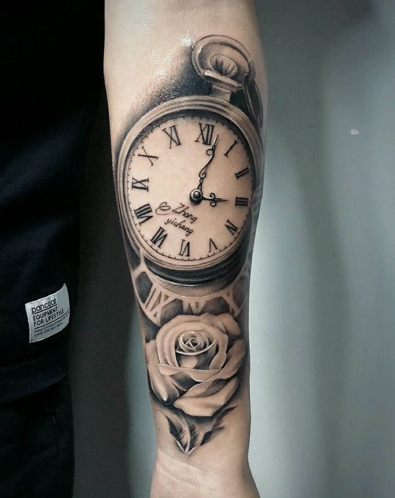 怀表玫瑰【根作品】纹身图片_手臂欧美写实静物原创怀表成品纹身图案