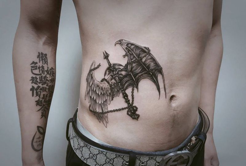 天使与恶魔【丰作品】纹身图片_腹部欧美写实天使恶魔翅膀纹身图案