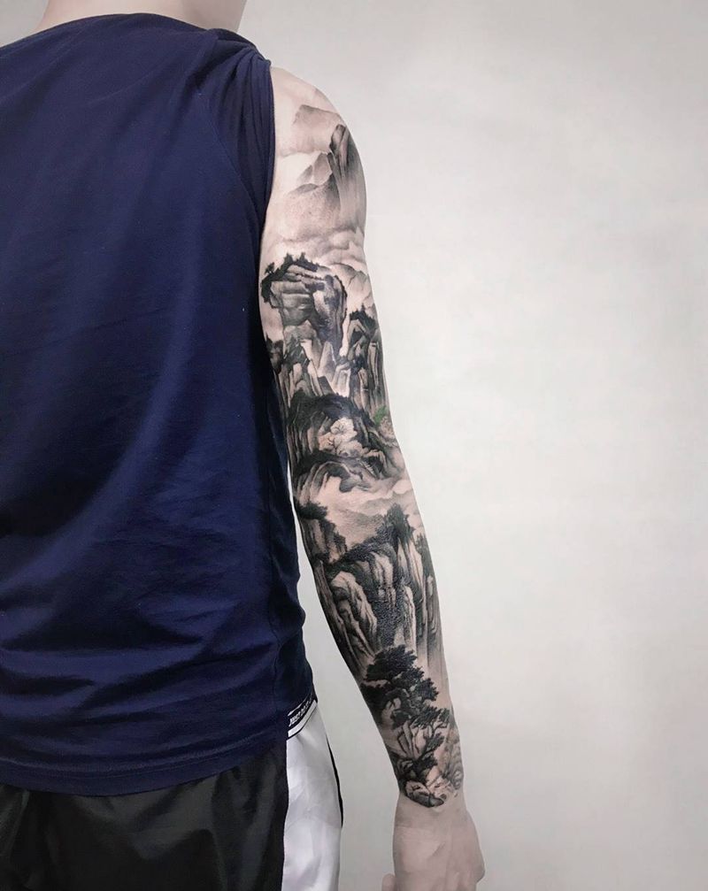 山水花臂【丰作品】纹身图片_手臂水墨山水中国风纹身图案