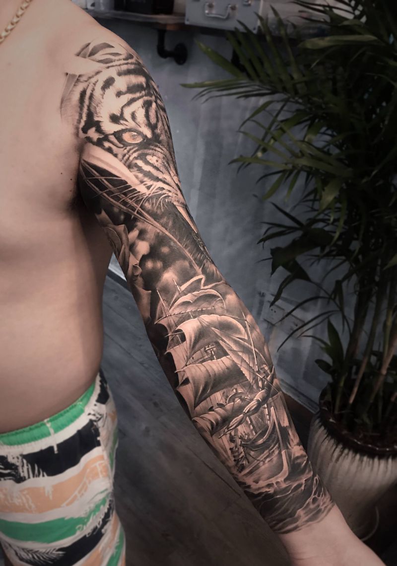 写实花臂【根作品】纹身图片_手臂欧美写实老虎骷髅帆船纹身图案