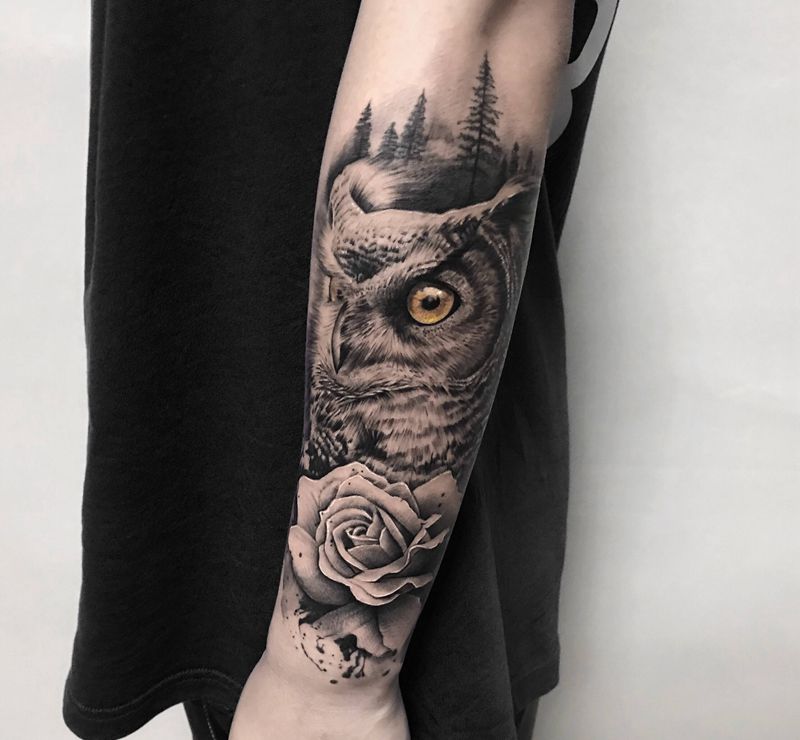 写实猫头鹰【根作品】纹身图片_手臂欧美写实猫头鹰玫瑰原创纹身图案