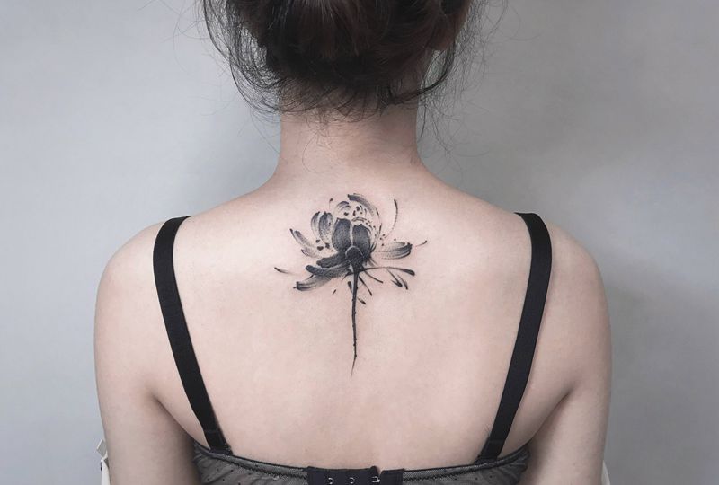 莲【根作品】纹身图片_背部颈部水墨莲花纹身图案