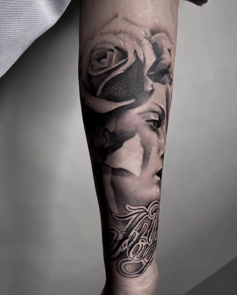 当前位置: 首页 >重庆市纹身店-木良拾贰文身艺术工作室纹身图案>欧美人物写实纹身图片_手臂欧美写实玫瑰奇卡诺人物纹身图案