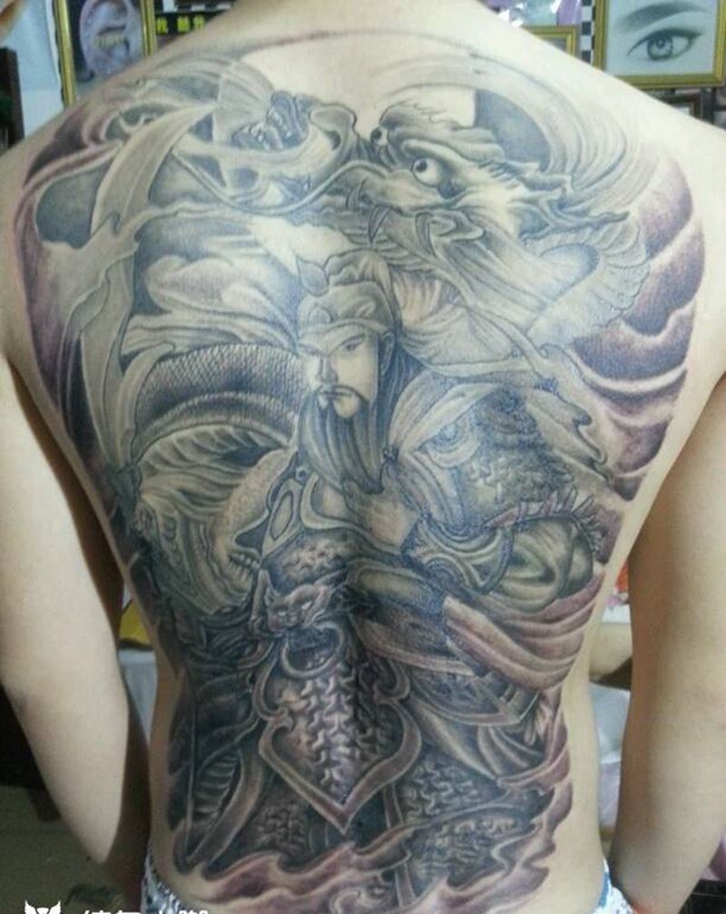 满背关公降龙纹身图片_背部传统成品纹身图案
