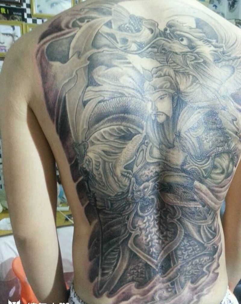 满背关公降龙纹身图片_背部传统成品纹身图案