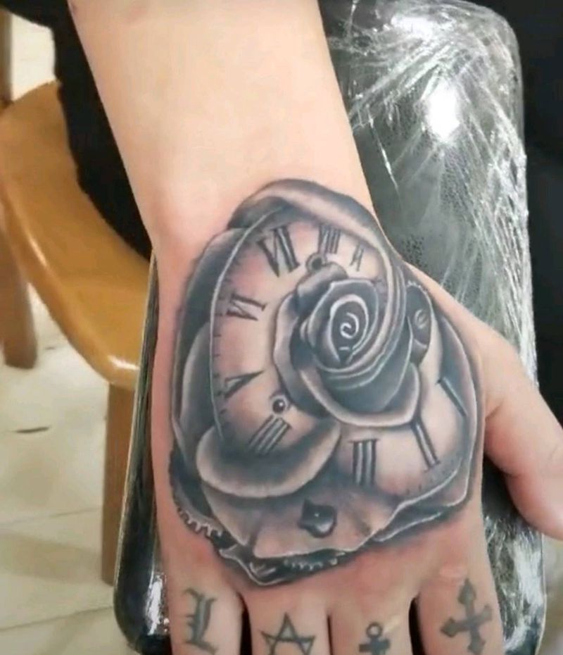 • 手背潮流时尚的玫瑰花眼睛纹身图案