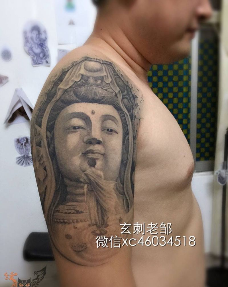 步步莲花纹身图片_成品手臂写实宗教人物纹身图案